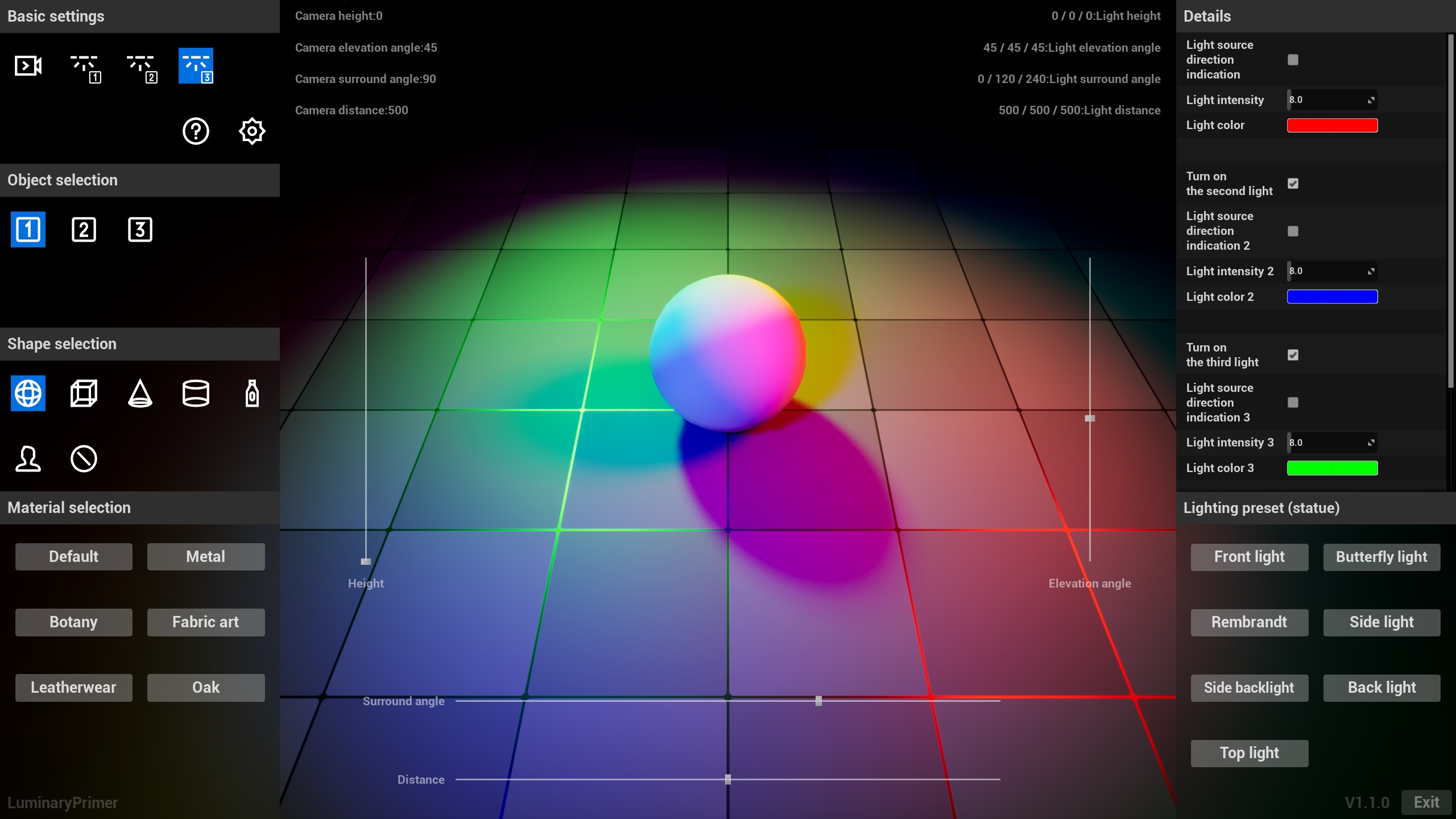 In order to display the illumination direction of each light source more intuitively, we specially added the light source direction indication function. By simple operation, the user can turn on or off this indicator switch, so that the actual path of each light source can be clearly seen.
